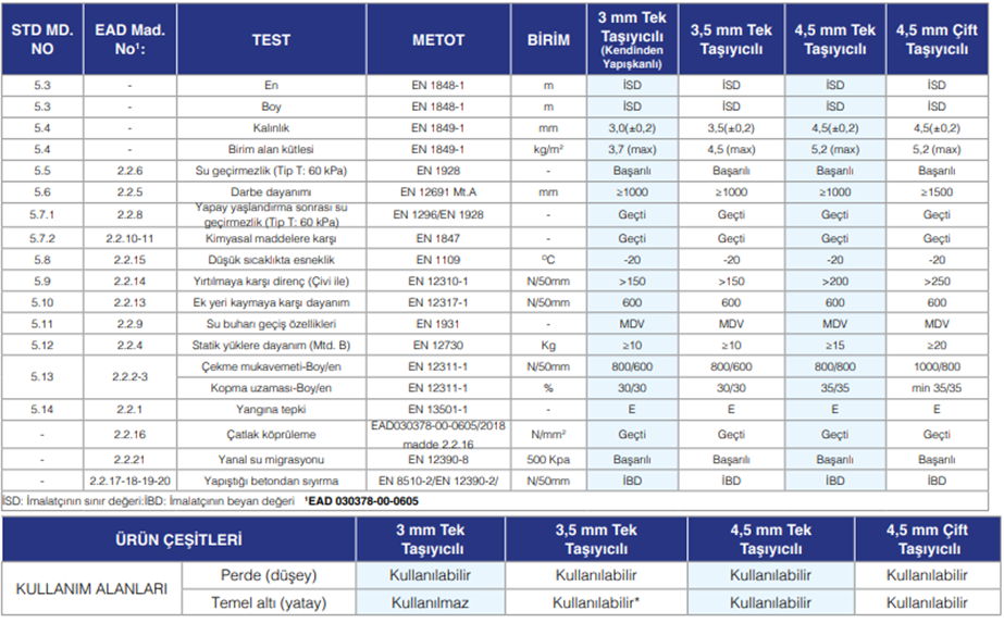 Üretimi yapılan Proof tipi bitümlü su yalıtım örtülerinin minimum üretim değerleri aşağıdaki tabloda belirtilmiştir.